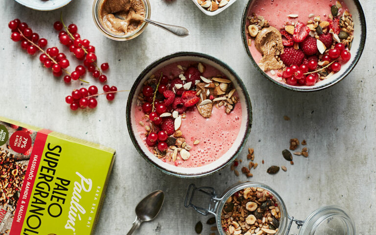 Acaibowl toppat med Paulúns Granola Hasselnötter & Dadlar, skivad banan, jordgubbar, blåbär och jordnötssmör.